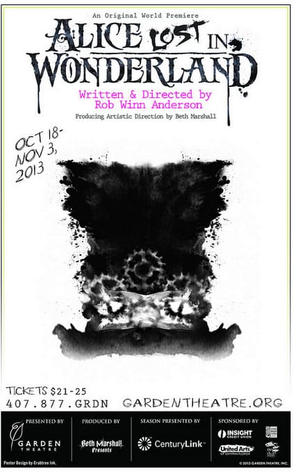 The Garden Theatre announces the original world premiere of Beth Marshall Presents’ production of Alice Lost in Wonderland, written and directed by award-winning playwright Rob Winn Anderson with producing artistic direction by Beth Marshall, October 18 – November 3, 2013, at the Garden Theatre (160 West Plant Street, Winter Garden). Alice Lost In Wonderland is sponsored by Insight Credit Union. The Garden Theatre’s 2013-2014 Season is presented by CenturyLink.