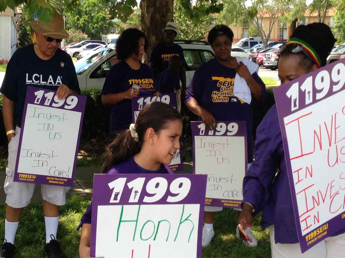 Certified Nursing Assistants (CNAs), housekeepers, dietary and maintenance workers and members of 1199SEIU United Healthcare Workers, turned out in force at the Rosewood Health & Rehab Center on Rosewood Way in Orlando, to protest the low wages and sub-standard working conditions of their employer, Consulate Health Care, the largest nursing home chain in Florida and the fastest growing private company in Central Florida.