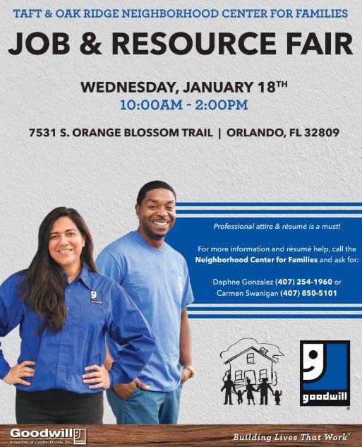 On Wednesday, January 18th, Goodwill Industries of Central Florida (GICF) is partnering with Taft & Oak Ridge Neighborhood Center for Families (NCF) to host a job fair from 10am to 2pm at Goodwill’s headquarters, located at 7531 S. Orange Blossom Trail.