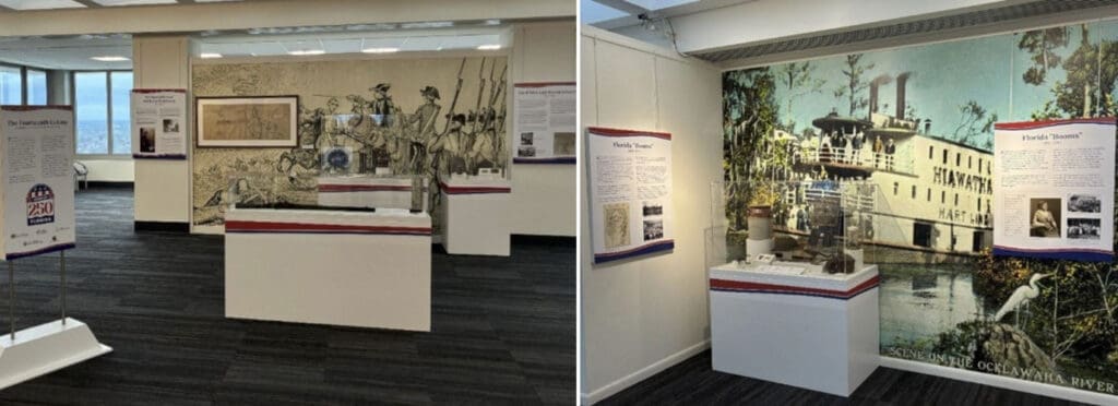 In honor of the American Semiquincentennial, “The 14th Colony” contains historical artifacts, works of art, significant documents, unique items, and patriotic memorabilia presented and curated by the Florida Department of State. The exhibit is located on the 22nd Floor Capitol Gallery and throughout the Capitol. “The 14th Colony” was produced in partnership between the Division of Historical Resources, Division of Library and Information Services and the Division of Arts and Culture.