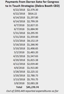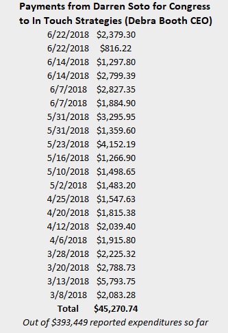 Soto’s campaign is clear that Carl Booth is the campaign employee and he has been paid nearly $50,000 through June as a “strategic consultant” according to FEC reports, and paid for “field services” according to Soto’s campaign. The campaign wouldn’t clarify further what exactly In Touch Strategies is providing in the primary. When pushed about where is the money going, the campaign repeated “field.” The campaign also denied that Booth was paying any other employees as a shield company, so the payouts have gone directly to In Touch Strategies alone. That’s a lot of money for “field work” for one person in just 4 months.