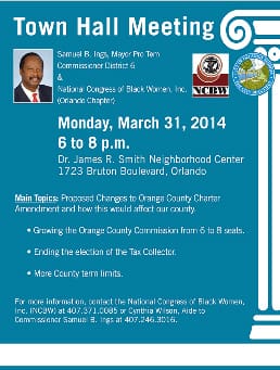 There are many other reasons for not letting this happen, and you can express your opinions at a Town Hall meeting on March 31 held at Dr. James R. Smith Neighborhood Center, 1723 Bruton Blvd. in Orlando from 6:00 to 8:00 PM. Special guest will be Beverly Neal of the Nat’l Congress of Black Women. Here’s the flyer: