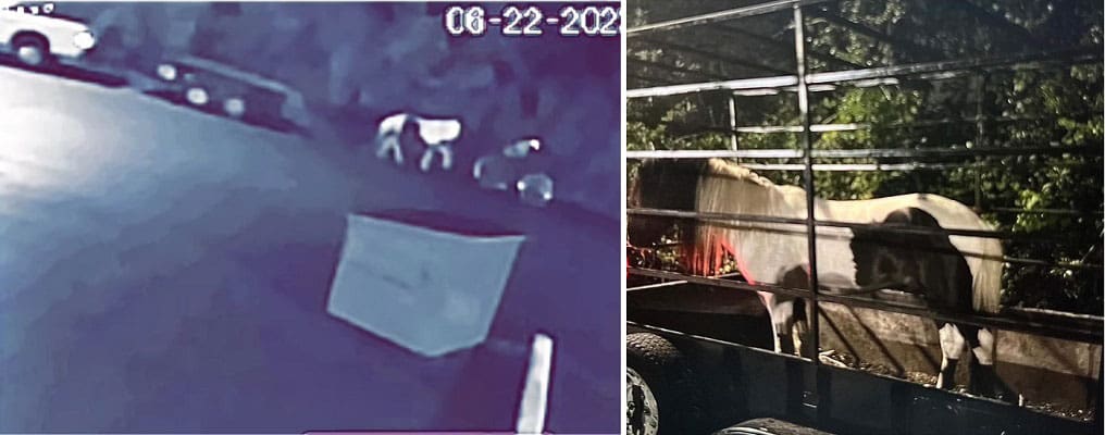 According to local police, on June 22nd at about 3:15am, a person on a bicycle stole a horse from its trailer while it was parked at 725 S. Kirkman Road. Here’s a photo from video surveillance and a better photo of the animal:
