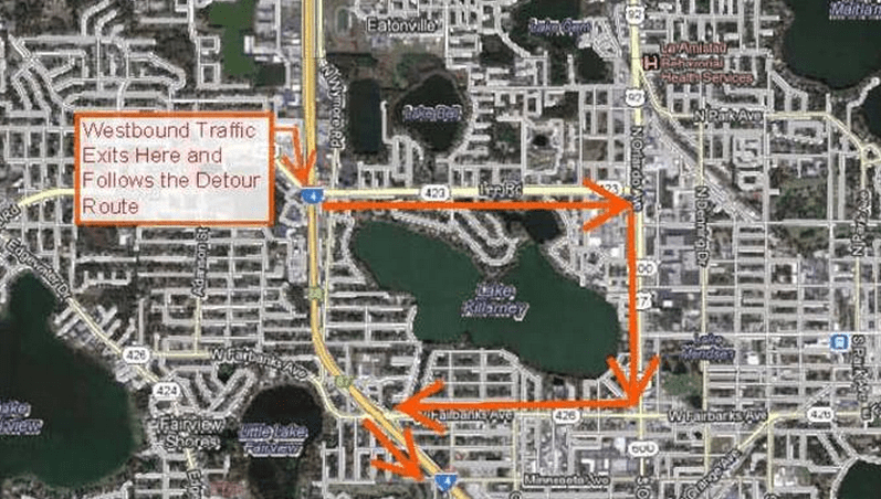 Total lane closure on Interstate 4 at Lee Road—and detours—are scheduled beginning Sunday night as construction on the westbound lanes enters its next phase. This is occurring so crews can cut grooves in the pavement that run perpendicular to the travel lanes. The grooves need to go across all the lanes without stopping. New road stripes will be put down as well. The project’s goal is to increase safety for the motoring public, especially during rain storms.
