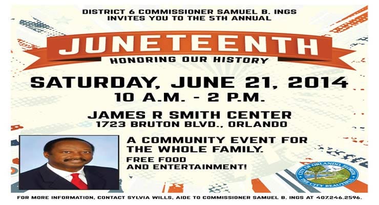 City of Orlando Commissioner Sam Ings (District 6) will host Juneteenth celebrations on Saturday, June 21, at the Dr. James R. Smith Center, 1723 Bruton Boulevard, Orlando, from 10:00 a.m. to 2:00 p.mThere will be guest performances by Kingdom Generation Church-Praise Dancer, Devery Broox-Spoken Word, YBA Bank, El Bethel Temple-Praise Dance Team, Native African Dance, Ms. Ruby and much, much more.