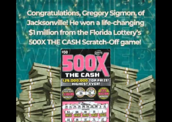 The Florida Lottery recently announced that Gregory Sigmon, of Jacksonville, claimed a $1 million prize from the 500X THE CASH scratch-off game at Lottery Headquarters in Tallahassee.