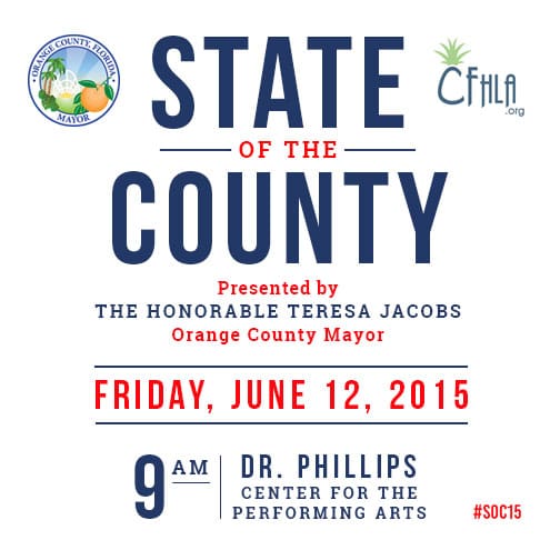 Orange County Mayor Teresa Jacobs will deliver her 2015 “State of Orange County” address. The annual address will take citizens on a journey highlighting the outstanding achievements of Orange County and the many milestones the community has accomplished together. The program is hosted by the Central Florida Hotel and Lodging Association and is free and open to the public.