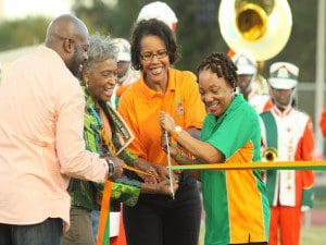 Orange County Public Schools Superintendent Barbara Jenkins, Orlando City Commissioner Daisy Lynum, Jones High School Principal Valeria Maxwell and Orlando City Chief Administrative Officer Byron Brooks joined together mid-field for a pre-game ribbon-cutting ceremony.