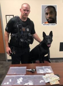 K9 Pantera hit the street just weeks after certifying in detection and helped officers locate cocaine inside the vehicle Green was driving. Cocaine was located in three separate locations inside the vehicle, along with amphetamine pills, cash and a handgun.
