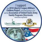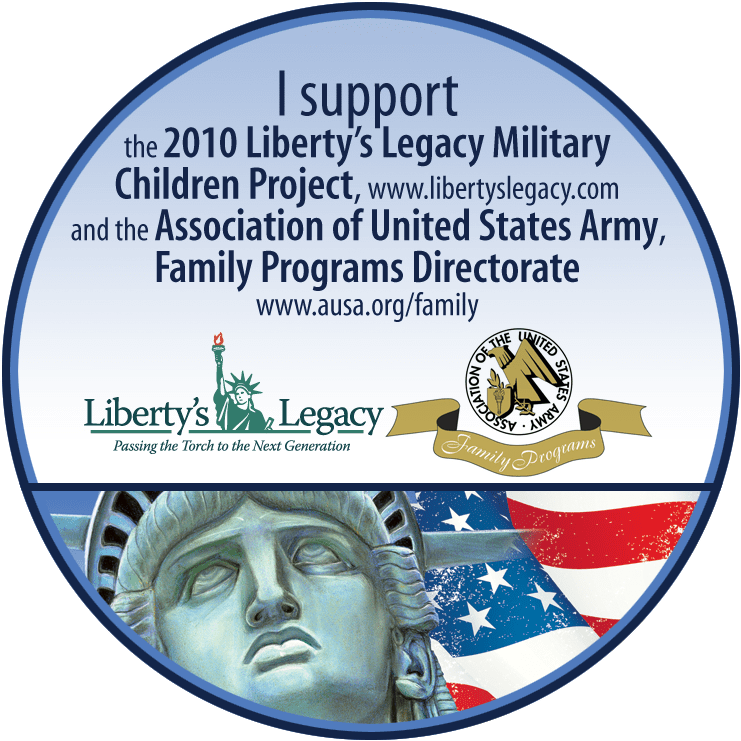 For more information on how to support the cause, please visit www.libertyslegacy.com or call 407-296-4183 or visit www.ausa.org/family. Promotional stickers designed to raise awareness for the “2010 Project Liberty’s Legacy Military Children” and AUSA’s Family Programs Military Children are free at participating businesses, schools, and community organizations, or go online to http://www.libertyslegacy.com/AUSA_Military_Children for a printable sticker.