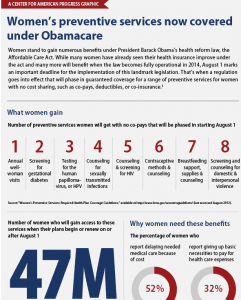 The Center for America Progress has prepared an infographic which depicts the the preventive services for women that will now be covered under Obamacare.