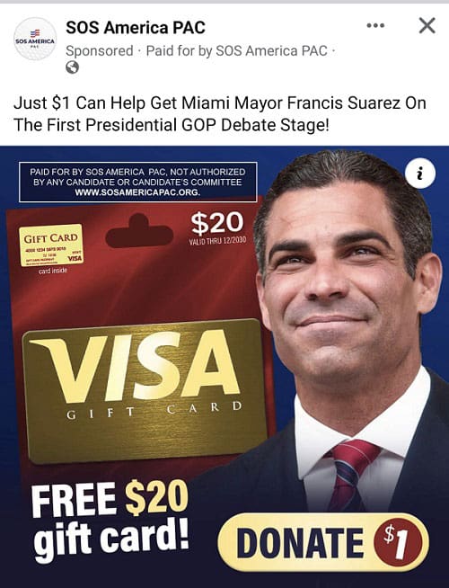 Miami Mayor Francis Suarez, an unpopular Republican who is now running for President, is begging for contributions and offering people a $20 gift card for a $1 political contribution. It’s not a good reflection of the strength of a candidate’s campaign when engaging in what some may call political bribery.