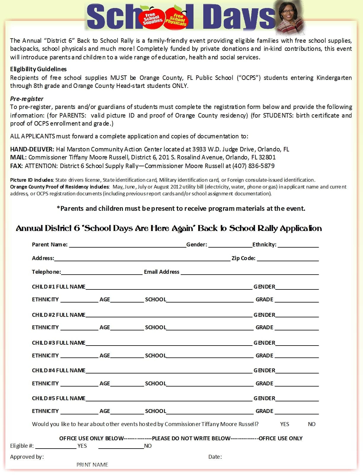 The Annual “District 6” Back to School Rally is a family friendly event providing eligible families with free school supplies, backpacks, school physicals and much more. Completely funded by private donations and in-kind contributions, this event will introduce parents and children to a wide range of educaiton, health and social services.