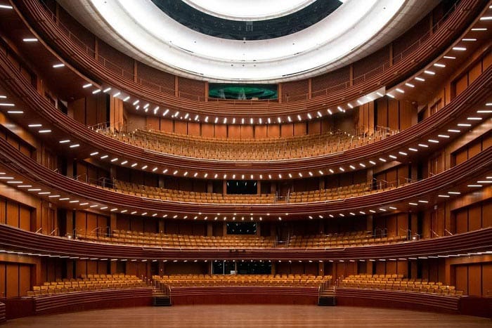 To achieve its perfect, N1 background sound rating, Steinmetz Hall is encased inside an exterior concrete frame and built on top of a floating concrete foundation. More than 400 isolation rubber pads placed between the theater and its foundation create an acoustic air gap that absorbs and deadens sound from traffic and other ambient noise. A mobile acoustical reflector in the ceiling also aids in sound movement. All surfaces, including cork floors, cherry millwork and automated acoustic fabric curtains, were designed to promote sound movement from performances and mitigate noise from the audience.
