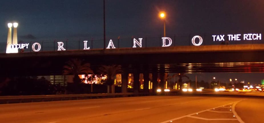 The action late last week lit up the bridge to say “Occupy ORLANDO Tax the Rich.” It was the first time the group used the word “Occupy” in their LED actions. It appears that is what caught the attention of the Orlando Police Department, who did make a stop that protesters simply called “basic intimidation tactics.” No police report appears to have been made from the incident and the group’s message was broadcast in the dark Orlando night.