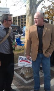 My wife and granddaughter went to the playground on the other end of the park while I tried to make sense of the event. We did have a short conversation with media creation Joe the Plumber who intimated to David “Duckie” Wasman that both these conservatives and the occupiers are not that far apart on most issues, something he would not ever say in public. Local Tea Party type Matt Falconer was urging people to vote against the proposed ballot initiative on Jan 31 that would allow corporations to avoid paying property taxes for 10 years if they merely promised to create jobs. Actually, Falconer made good sense this day and apparently a lot of the attendees were in agreement with him. Only registered Republicans and people signed up for absentee ballots were officially notified that this was a general ballot item. In all though, it seemed like a scene out of 1984 with a collective hate for “Big Brother” (code for Barak Obama).