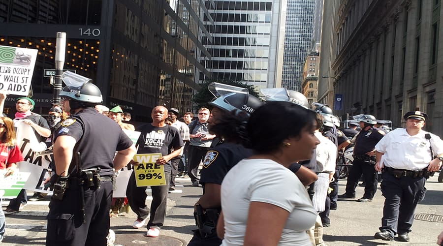 New York police officers seemed prepared for Occupy Wall Street protesters, as they converged Monday, near the New York Stock Exchange, on the first anniversary of the movement.