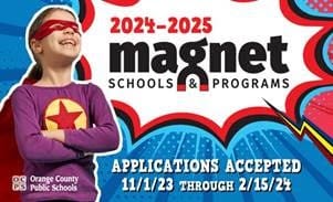 See a list of all OCPS magnet programs offered at the elementary, middle and high school level.Students must apply for the magnet program online. If there are more applicants than the number of seats available in a specific program, students are selected through a lottery. The application window is November 1, 2023 – February 15, 2024.