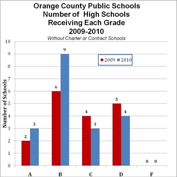 Buoyed by improved graduation rates, Orange County Public Schools saw eight of its high schools’ grades rise in 2010, although four received a D-rating. Most notably among the improvements was Jones High School that rose from a “D” to a “B”. Colonial, Edgewater and Jones High Schools received their first ever “B” grades from the state grading system.