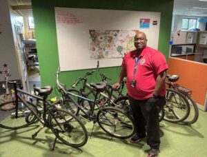 Photo: Chris Peavy, a Navy Veteran and Orlando VA Healthcare System employee, stands in front of donated bicycles used to support Veterans in need of transportation.
