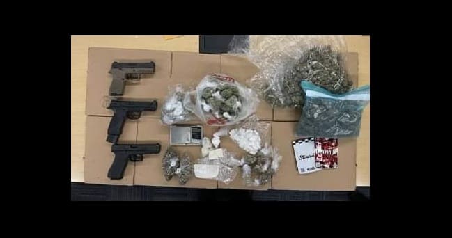 Officers seized 51g of cocaine, 11g of MDMA, 1.5lbs of cannabis, nearly $1500 in cash, and three firearms, where two had been reported stolen. Here’s a photo of what the police recovered:
