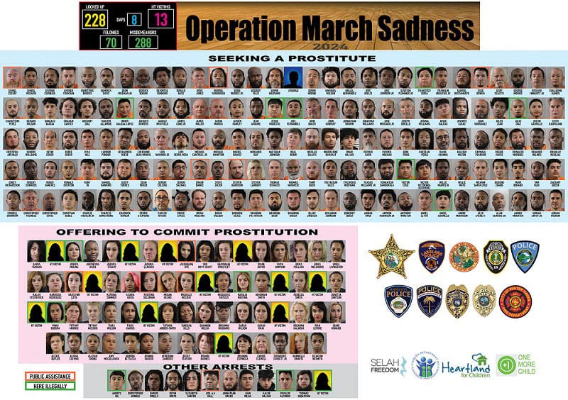 During Operation March Sadness, an eight-day-long undercover human trafficking operation, the Polk County Sheriff’s Office Vice Unit arrested 228 suspects involved in illegal acts related to soliciting prostitutes, offering to commit prostitution, or aiding and abetting prostitutes in Central Florida.
