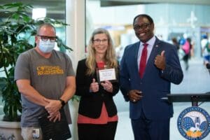 Orange County Mayor Jerry Demings, along with Florida Department of Health in Orange County Director Dr. Raul Pino recognized Orange County Convention Center Event Manager Janice Reindl with Orange County’s Public Health Hero Award at the Orlando International Airport. Reindl has served as the Event Manager for the COVID-19 mass vaccination site at the Convention Center for the last five months.