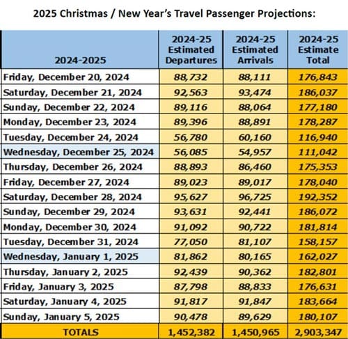 The 2024 holiday travel period began on Friday, December 20th and runs through January 5, 2025. During the 17-day period, MCO is expecting 2.9 million passengers, a slight increase of 1 percent over 2023’s record numbers. The busiest travel day is expected to be Saturday, December 28th, with more than 192,000 total arrivals and departures.
