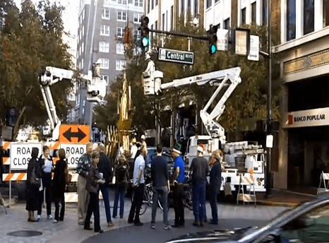 This morning, the Jack Kazanzas Star was raised over Orange Avenue, near Central Boulevard. The tradition of raising the 600-pound golden star started in the 1950s when two competing department stores, Ivey’s on the east and Dickson &Ives on the west of Orange Avenue, joined together in 1955 to hand the Christmas star between the two. In 1984, after the department stores had closed, Jack Kazanzas, a lifelong resident of Orlando, led a campaign to raise funds to replace the original Christmas Star that had fallen into disrepair.