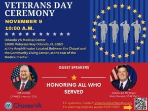 The Orlando VA Healthcare System (OVAHCS) will host a Veterans Day Ceremony, tomorrow, Thursday, November 9, 2023, at 10:00am at the new amphitheater, located at the back of the Orlando VA Medical Center next to the Community Living Center, in Lake Nona, Orlando, Florida.