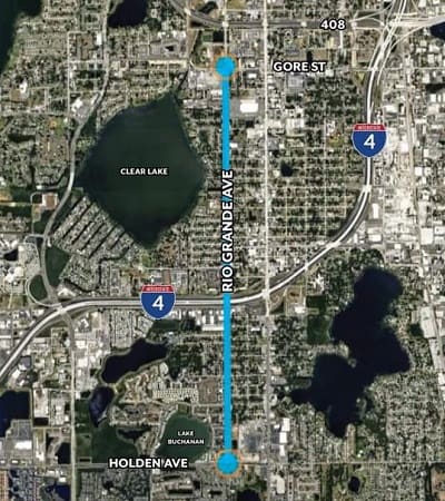 The scope of the S. Rio Grande Avenue project includes midblock crossings with enhanced raised refuge islands for pedestrians and rectangular Rapid Flashing Beacons.The outside travel lanes northbound and southbound will be repurposed to provide a 7-foot-wide bike lane with a 4-foot buffer between I-4 and Gore Street.