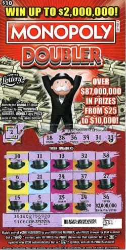 The $10 MONOPOLY DOUBLER features more than $176 million in cash prizes, including eight top prizes of $2 million. The game’s overall odds of winning are one-in-3.51.