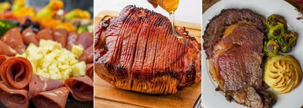 Holiday family meals-to-go serve eight people and include a protein with traditional side dishes such as garlic mashed potatoes and fresh green beans. Protein options range from sage butter whole turkey with pan gravy to prime rib with au jus and horseradish sauce. Each meal comes with heating instructions for easy preparation at home.