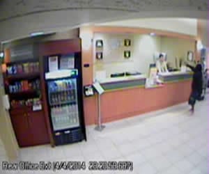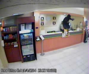 The suspect, who wore a ski mask, entered the hotel just before 11:30 p.m., and approached the front desk. He pointed a handgun at the front desk clerk, jumped over the counter and ordered the clerk to empty the cash register. The clerk complied.