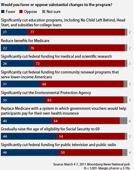 The survey asked about a number of domestic areas and found opposition to cuts in eight different areas. Views ranged from 77-21 opposition to significantly cutting education programs to 50-46 opposition to significantly cutting funding for public television and radio.