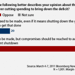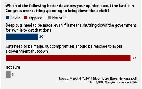 Conservatives are continuing their efforts to enact deep cuts in domestic spending and acting like they are willing to shut down the government if they don’t get their way. But the public doesn’t want deep cuts in most domestic spending areas, and it is decidedly unenthusiastic about shutting down the government to attain these cuts. Consider these results from a just-released Bloomberg News poll on March 14.