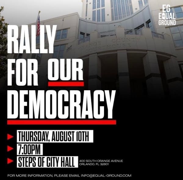 The “Rally for Our Democracy” will take place on August 10th at 7pm at Orlando City Hall. The groups planning to rally in Orlando said they are confronting petty politics and white supremacist ideologies that target Black women in politics, and attempt to devalue their contributions to expanding and protecting U.S. democracy.