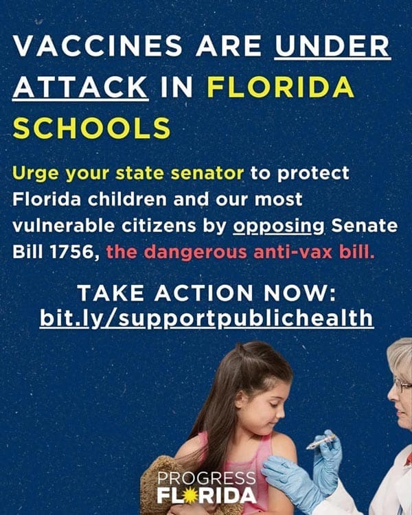 Progressives are saying that “dangerous anti-vaccinations legislation” in the state legislature puts Floridians at risk, saying it will lead to “lower vaccination rates and more disease, sickness, and death.”