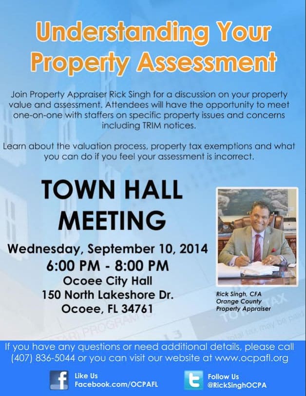 Join Orange County Property Appraiser Rick Singh for a discussion on your property values and assessments at a Town Hall meeting on Wednesday, September 10, at the Ocoee City Hall, 150 N. Lakeshore Drive, Ocoee, from 6:00 p.m. to 8:00 p.m.