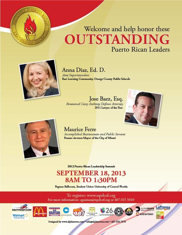 The 2013 Puerto Rican Leadership Summit will take place on September 18, 2013, at the University of Central Florida, Pegasus Ball Room, Student Union from 8:00 a.m. to 1:30 p.m.