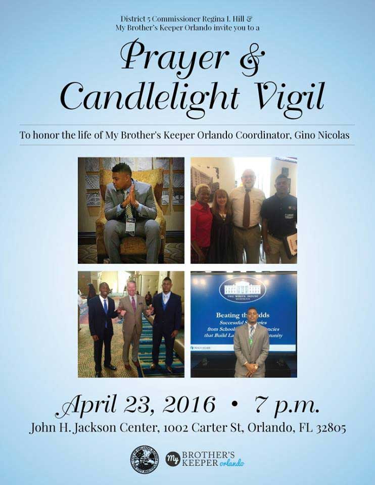 District 5 City Commissioner Regina I. Hill and My Brother’s Keeper Orlando invite the community to a prayer and candlelight vigil to honor the life of Gino Nicolas on Saturday, April 23 at 7pm. Nicolas was the Coordinator of My Brother’s Keeper Orlando.