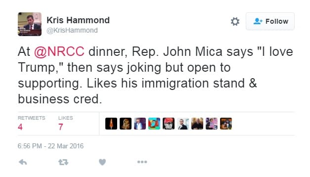 Kris Hammond, an elected delegate to the 2016 GOP convention who also is a member of #NeverTrump, tweeted news of Mica’s love for Trump. “Rep. John Mica says ‘I love Trump,’ then says joking but open to supporting,” Hammond tweeted. “Likes his immigration stand & business cred.”
