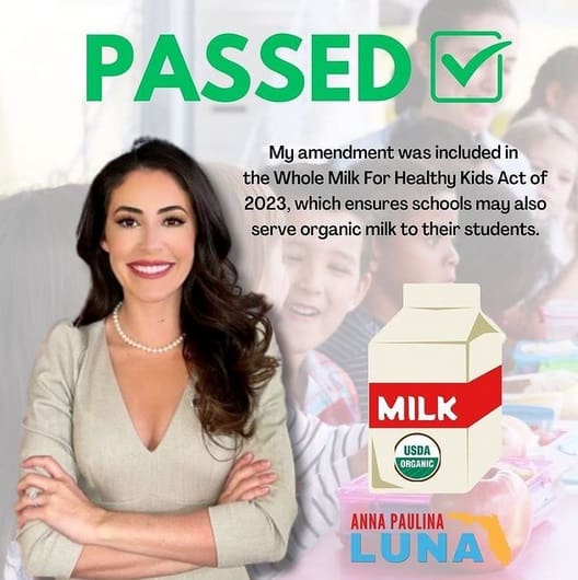 Florida Representative Anna Paulina Luna’s amendment to ensure American schools know that they may serve organic milk to their students was passed by the U.S. House in the Whole Milk for Healthy Kids Act of 2023.
