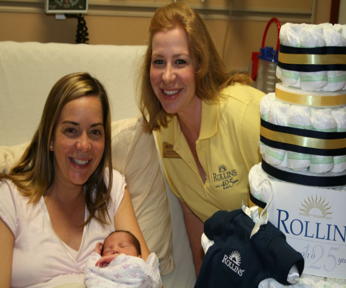 As part of Rollins College’s 125th anniversary celebration on November 4th, every baby born at Winter Park Memorial Hospital’s Dr. P. Phillip’s Baby Place, received an official Rollins College “onesie,” complete with a commemorative 125th Rollins anniversary certificate. In addition, each baby was given 125 diapers to help celebrate this milestone in Rollins’ history.