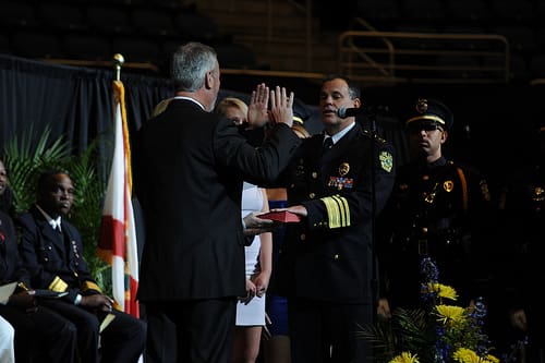 In front of hundreds of City residents, Mayor Buddy Dyer swore-in the Orlando Police Department’s new Chief of Police Paul Rooney, with the time-honored tradition of the Change of Command ceremony on Thursday, June 9, 2011. The Change of Command symbolizes the official transfer of authority and responsibility from one Chief of Police to the next. It marks a historic moment in the history of the City of Orlando as Chief Paul Rooney is sworn in as the 37th Police Chief.