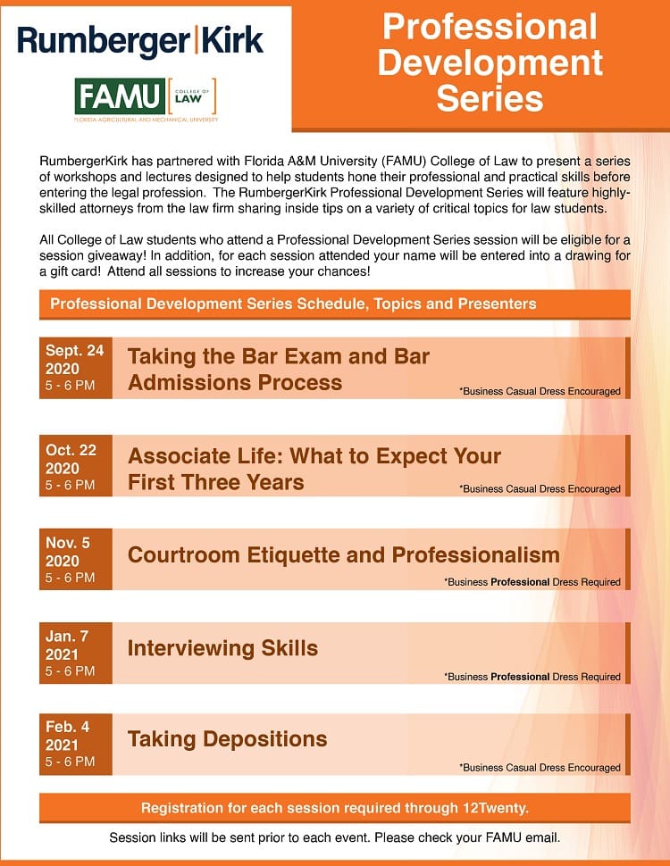 For the second year in a row, RumbergerKirk will host a series of workshops for Florida A&M University College of Law students during the 2020-2021 academic year. The RumbergerKirk Professional Development Series will move to a virtual format and will feature four workshops designed to help prepare the next generation of leaders for the ever-changing legal industry.