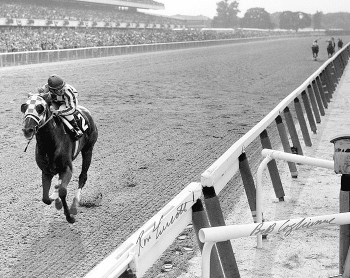 Many knowledgeable horseracing fans cursed Ron Turcotte, Secretariat’s rider, for running the horse at such a reckless speed. They felt sure that the horse would run out of steam, lose or even die in the process. Turcotte would later say that the pace was beyond his control and Secretariat just wanted to run. Many more felt that Turcotte would be harmed traveling at such high-speed. The picture below shows a curious Turcotte as he tried to look behind him. He later said, “Looking back momentarily I became even more scared and turned back around.” Spectators said they would not have been surprised if Secretariat took to flight like Pegasus. Most wept openly at the vision of a rare moment of perfection in an otherwise imperfect world and time.
