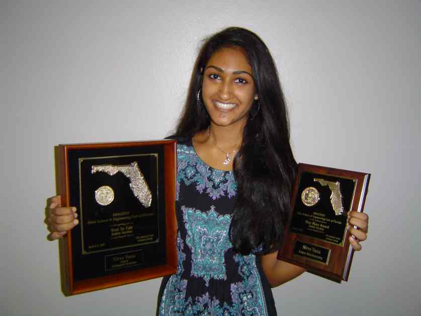 The winner of the Senior Division Grand Award (Dr. Nelson Ying Scholars Grand Award) was Neel Patel from Oviedo High School. Neel’s science teacher is Mrs. P.J. Kreahling and the title of his project was: A Psychological Analysis of Sonification Comprehension: A 4th Year Study. As part of the Grand Award winner, Neel won a $100 from the Florida Association of Science Supervisors, a certificate from the American Psychological Association, a $25 from the Brevard: Intercostal Regional Science and Engineering Fair, a $20,000 nomination for a Cram Scholarship at Rollins College and a $1,000 and a trip to the International Science and Engineering Fair in Pittsburgh, PA.