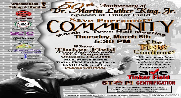 Community organizations, including National Action Network- Central Florida Chapter, Fight Back Coalition and Believers Outreach Ministries will hold a March and Town Hall Meeting on Thursday, March 6 at 5:30 p.m., to protest the planned tearing down of Tinker Field, the historic site of Dr. Martin Luther King, Jr’s., historic Orlando speech in 1964.