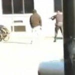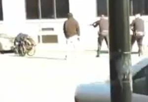 Four plainclothes and two uniformed officers surrounded the wheelchair-bound man on Tuesday, as seen in this cellphone video uploaded to YouTube. He was reportedly armed with a knife and a chunk of concrete.